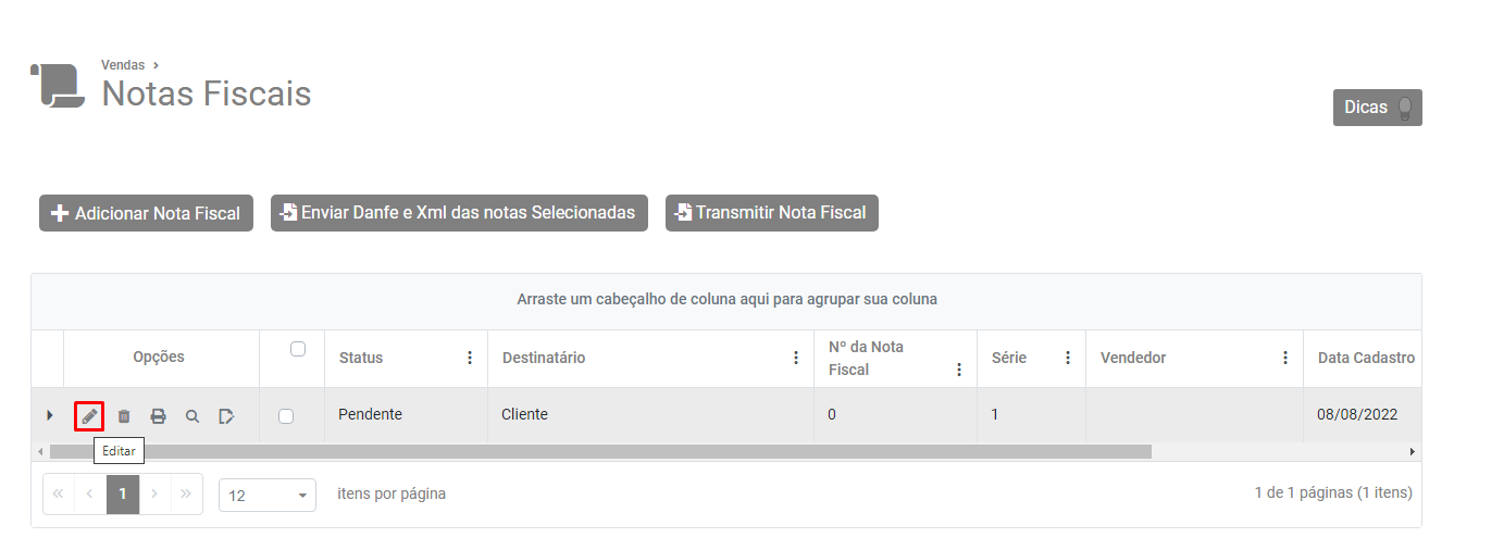 Em seguida, selecione a Nota e clique no botão Transmitir Nota Fiscal