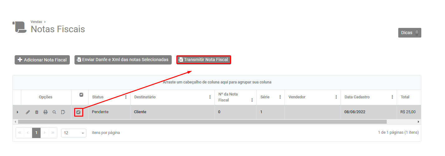 Salve a Nota Fiscal Eletrônica novamente e em seguida selecione a mesma e clique no botão Transmitir Nota Fiscal