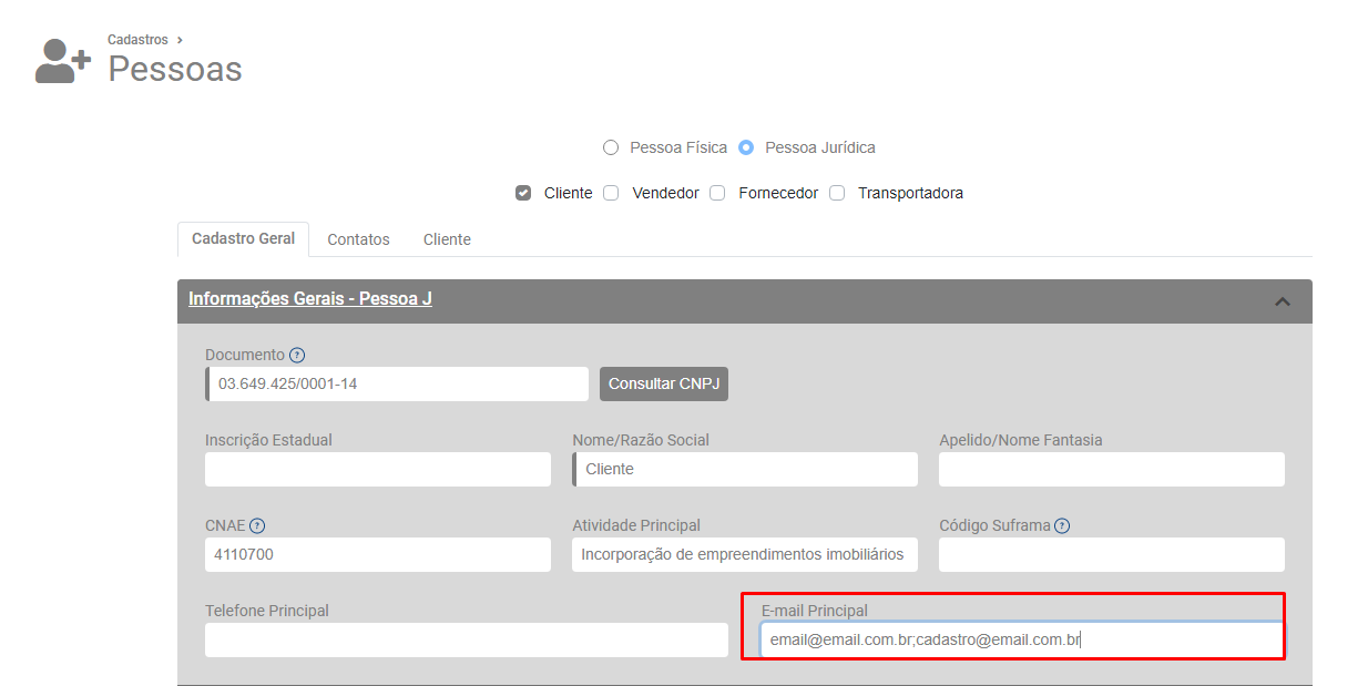 Verifique se foram cadastrados mais do que um email para o cliente, em caso afirmativo faça alteração e deixe apenas um email no cadastro. Salve o cadastro do cliente.