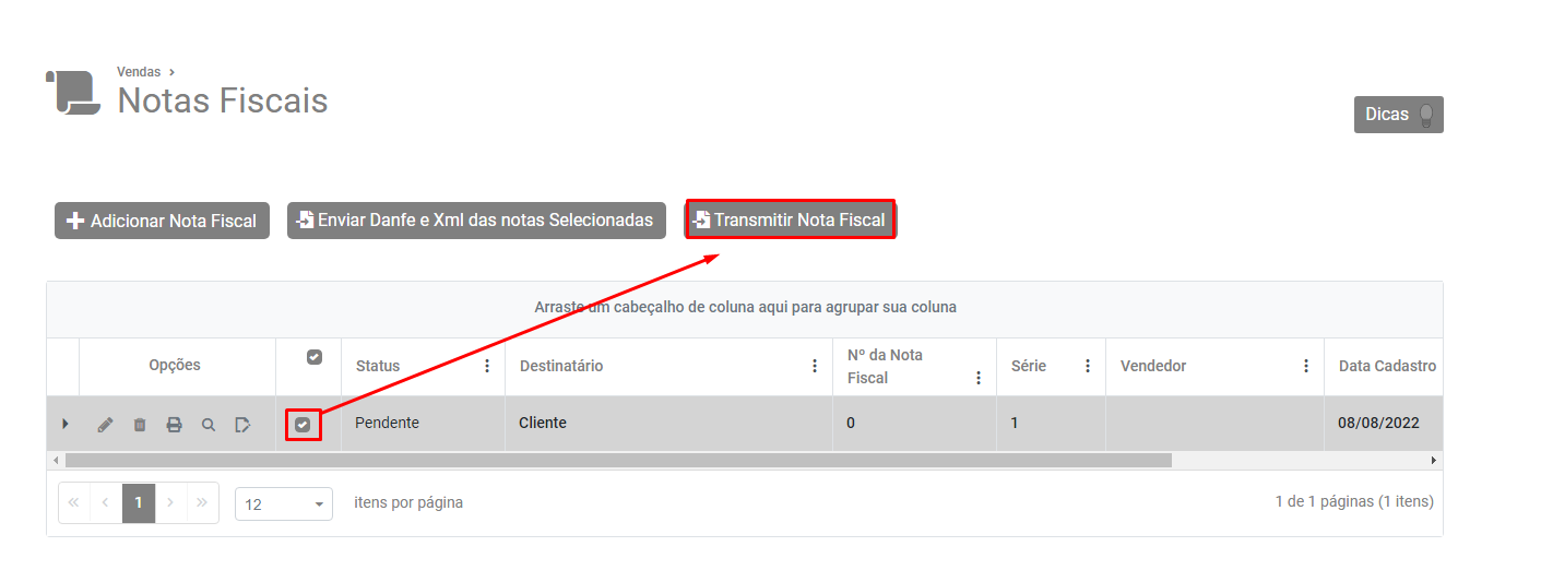 Selecione a NFe e clique no botão Transmitir Nota Fiscal