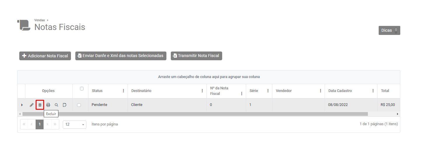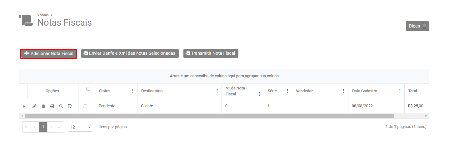 Em seguida clique no botão Adicionar Nota Fiscal e faça seu cadastro novamente.