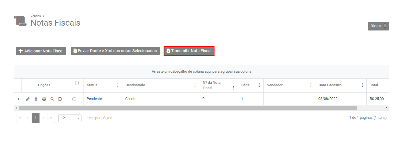 Após cadastrada clique no botão Transmitir Nota Fiscal
