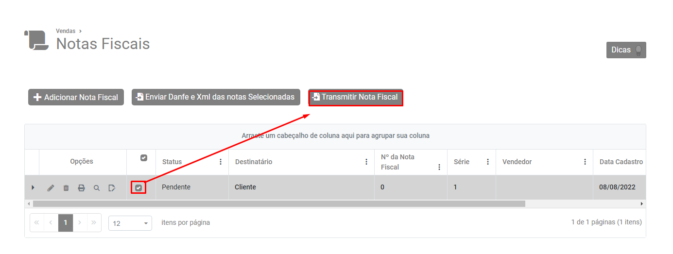 Selecione a nota no Grid e clique no botão Transmitir Nota Fiscal.