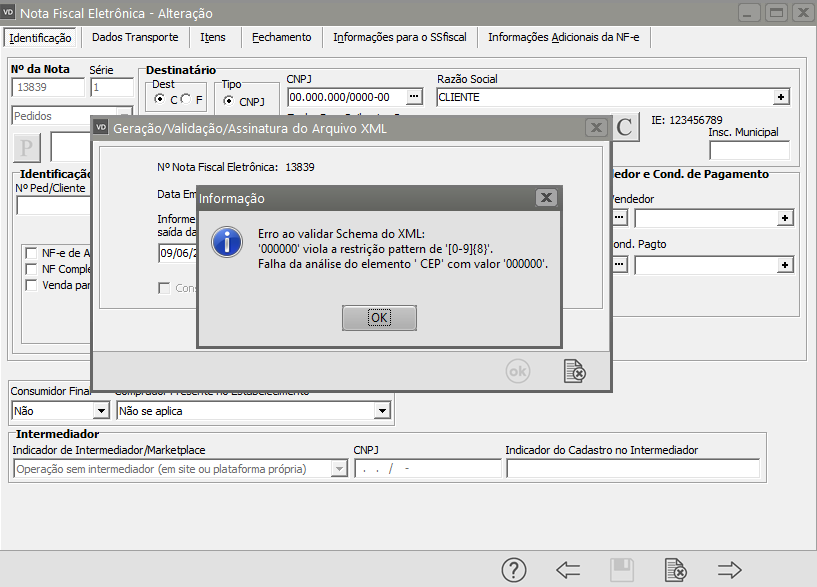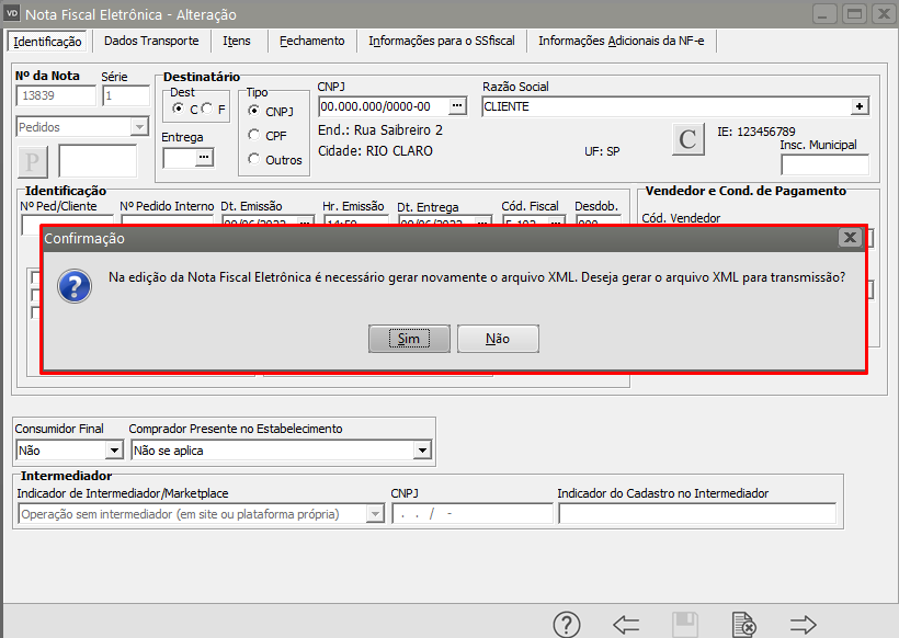 Procure pelo cliente (para que o Sistema atualize as informações que você alterou), em seguida salve a NF-e novamente.