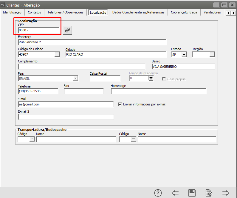 Acesse a aba Localização e confira a informação digitada no campo CEP, faça a correção e salve o cadastro.