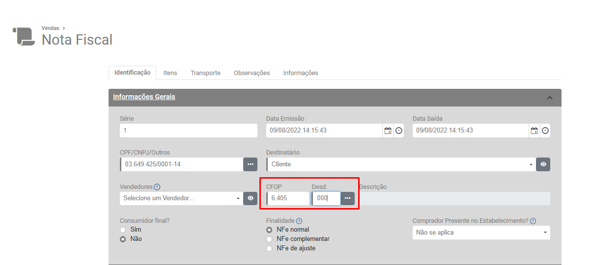 Falha da análise do elemento ' CFOP' com valor '6405'