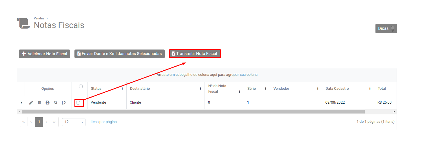 Em seguida salve a Nota Fiscal Eletrônica e selecione a mesma no Grid, em seguida clique no botão Transmitir Nota Fiscal.