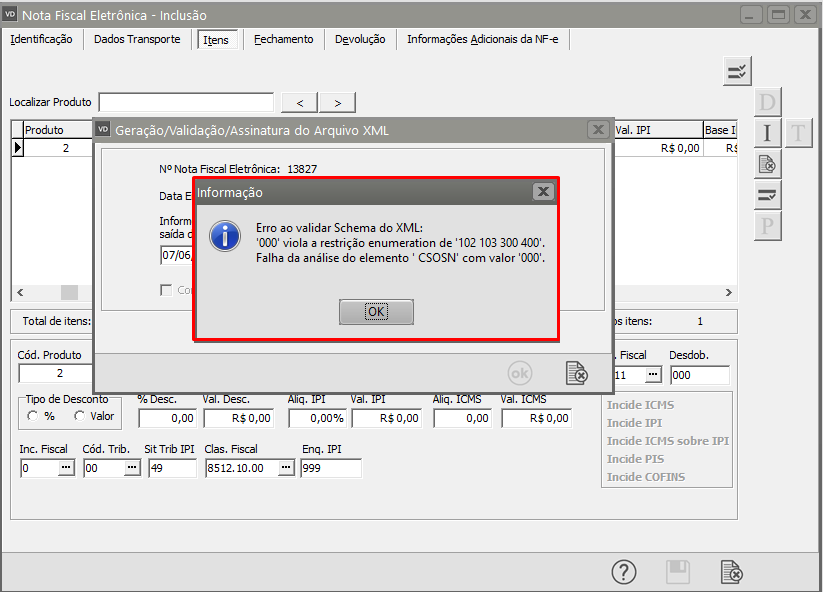 Erro ao validar Schema do xml: "000" viola a restrição enumeration de "102 103 300 400". falha da análise do elemento 'CSQSN' com valor '000'.