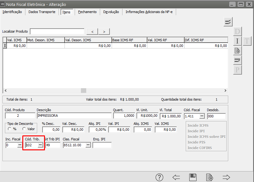 Acesse a aba Itens e verifique se a informação do campo Código de Tributação está correta