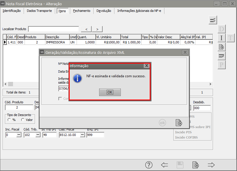 Se todas as informações estiverem corretamente cadastradas a NF-e será assinada e validada com sucesso.