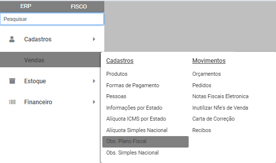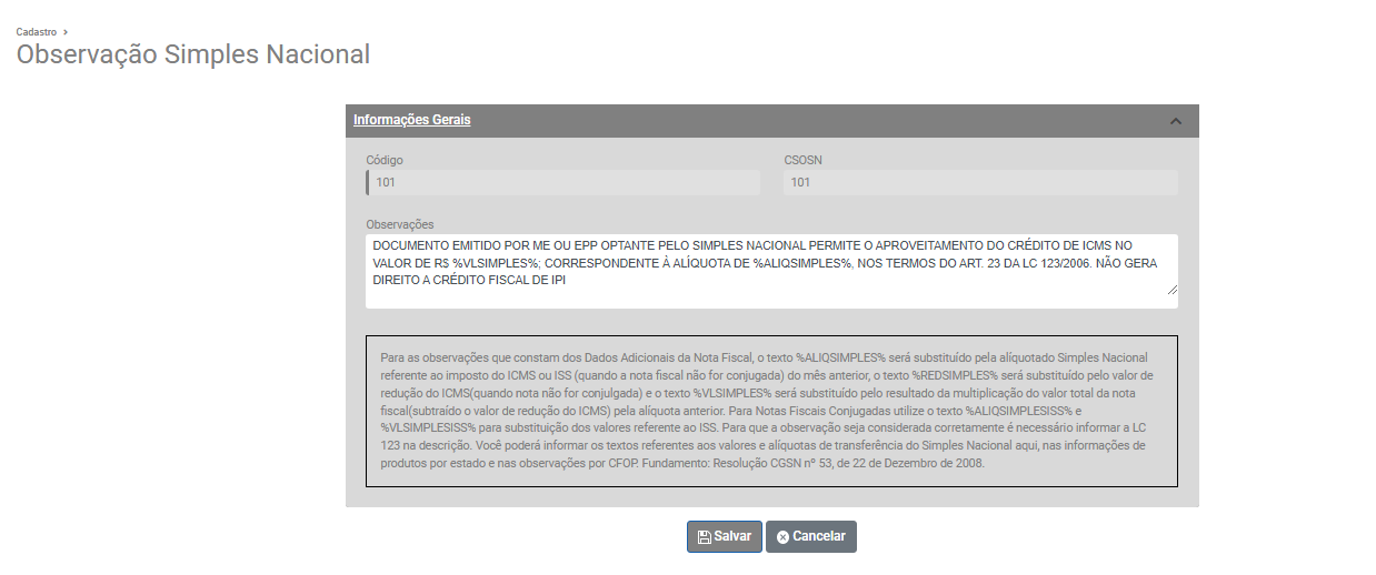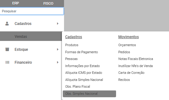 Em seguida acesse o menu Vendas>Observações Simples Nacional