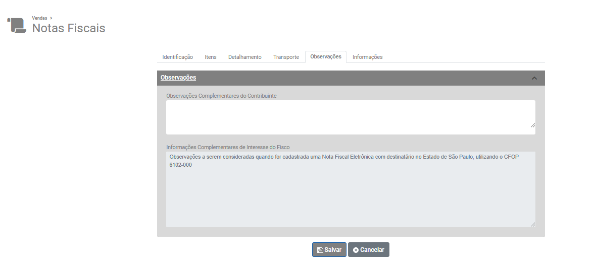 Acesse a aba Observações e confira se as informações estão corretas e se a observação está dentro do limite de 2000 caracteres estipulado pela Sefaz, em caso negativo faça a correção necessária, verifique também se a observação cadastradas possui caracteres especiais, em caso positivo exclua ou substitua esses caracteres especiais.