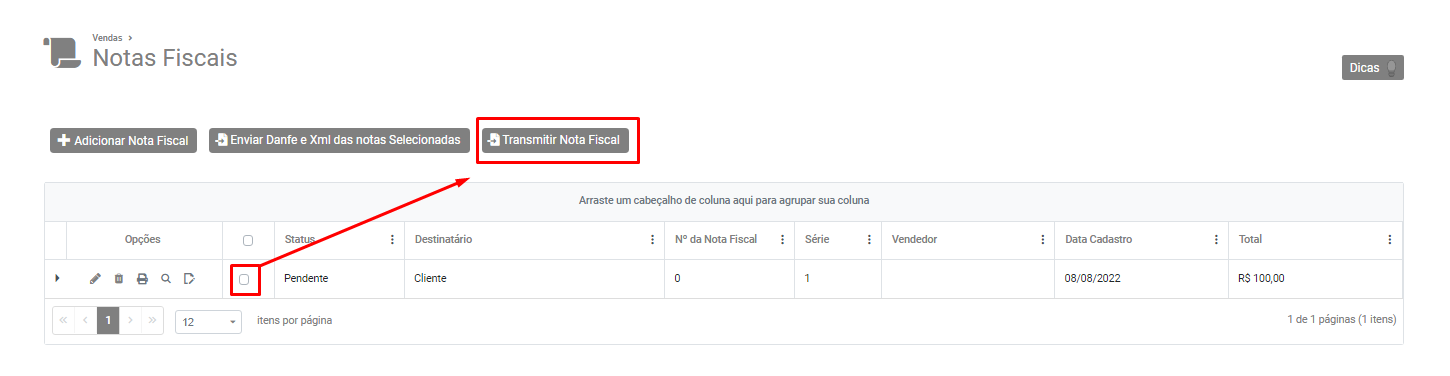 Após salvar a NFe, faça a seleção da mesma e em seguia a transmissão para a Sefaz.