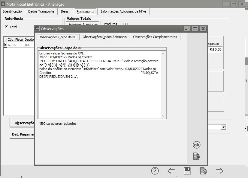 Verifique se as informações cadastradas na observação não possui mais do que 2000 caracteres, verifique também se essa observação possui caracteres especiais e em caso afirmativo, exclua ou substitua esses caracteres. Após realizar as correções Salve a NFe.