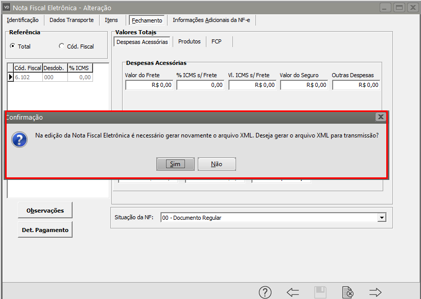 Em seguida Salve a NF-e e o Sistema irá questionar se você deseja que seja gerado um novo arquivo XML para transmissão, clique em SIM