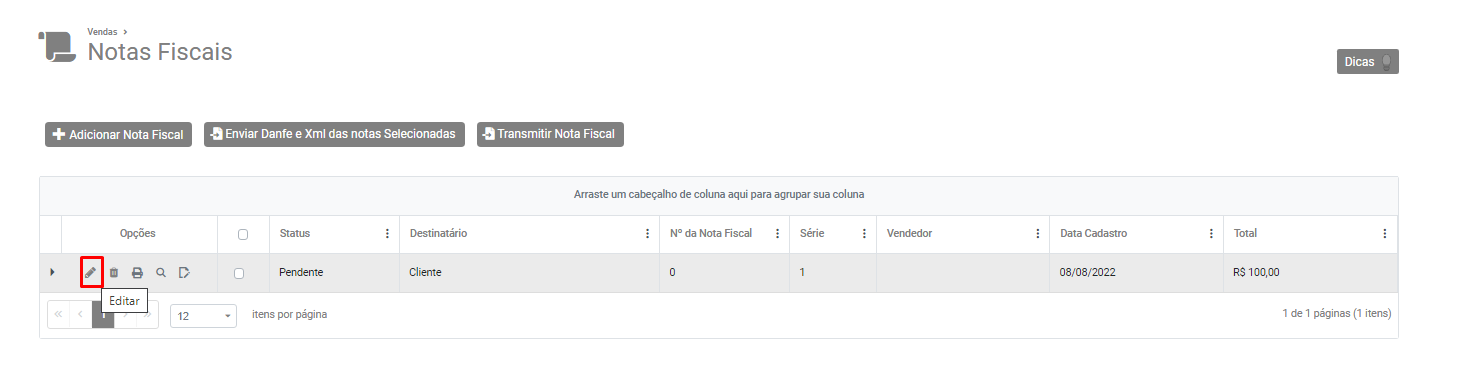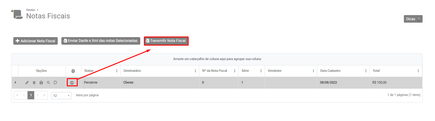 Salve a Nota Fiscal Eletrônica e faça novamente a seleção da mesma, em seguida clique no botão Transmitir Nota Fiscal.