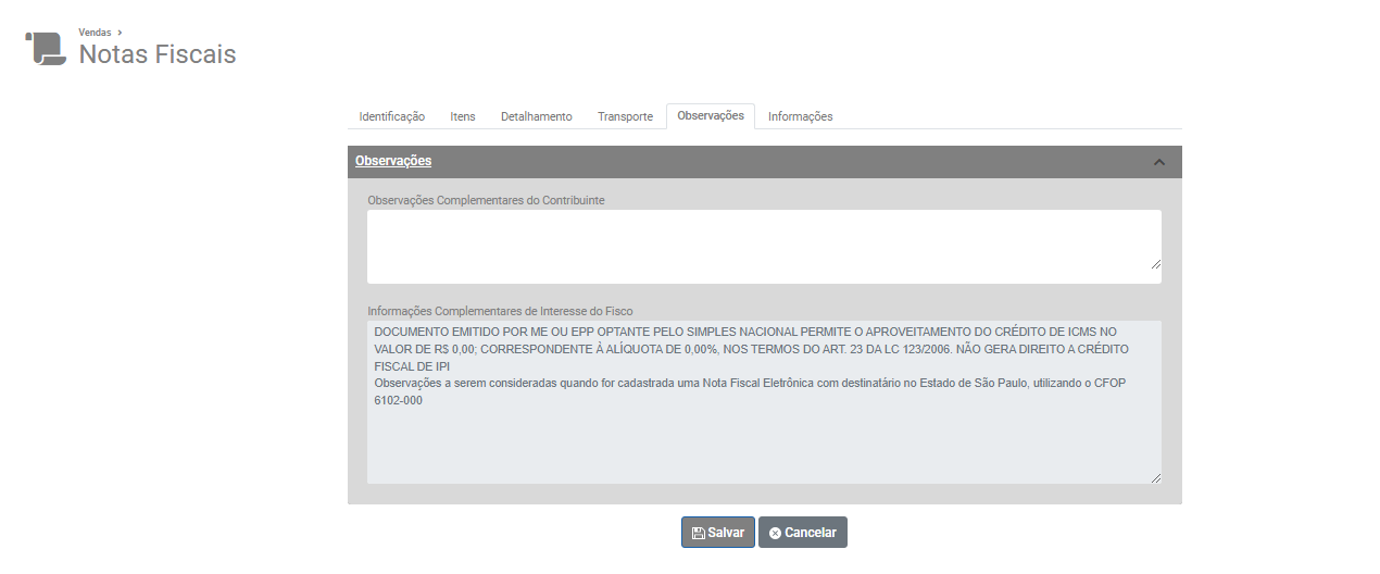 Observação: O ideal é que você corrija os caracteres especiais também na origem das informações (menus Vendas>Observações Plano Fiscal e Vendas>Observações Simples Nacional, desta forma, para uma próxima nota essa inconsistência não voltará a acontecer.