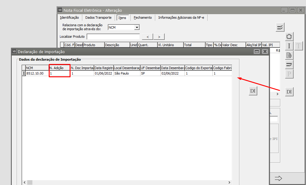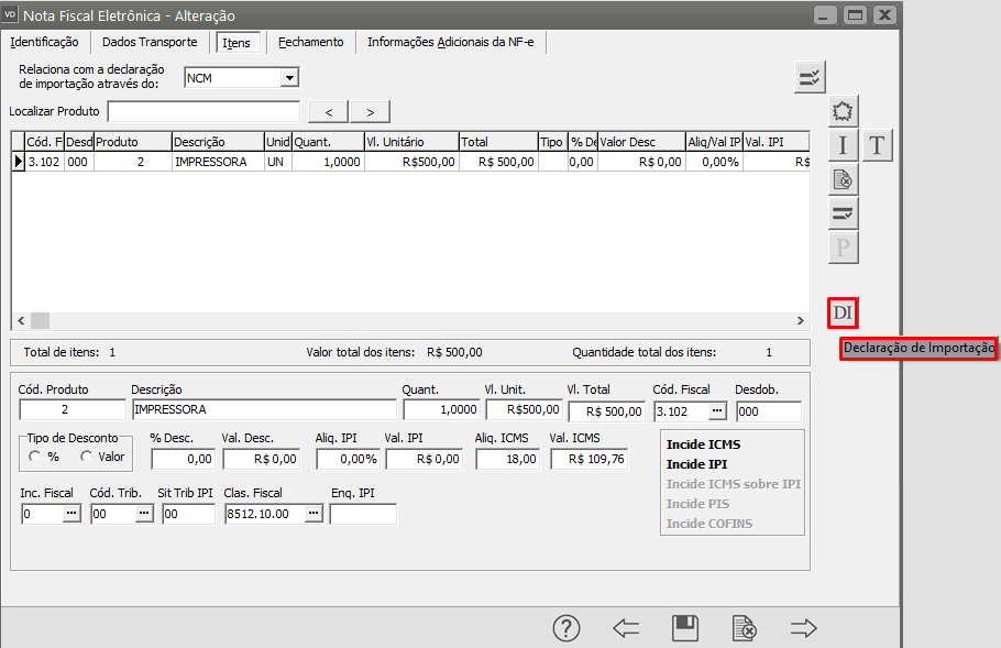 Acesse a aba Item e clique no botão Declaração de Importação.