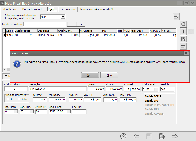 Salve novamente a NF-e e o Sistema irá questionar se você deseja gerar um novo arquivo XML para transmissão, clique em Sim.