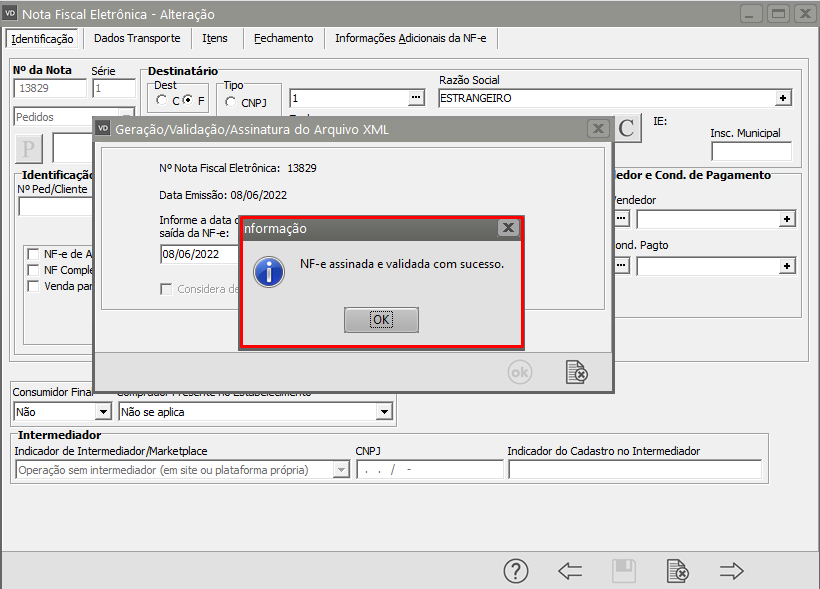 Se todas as informações estiverem corretamente cadastradas a NF-e será assinada e validada com sucesso.