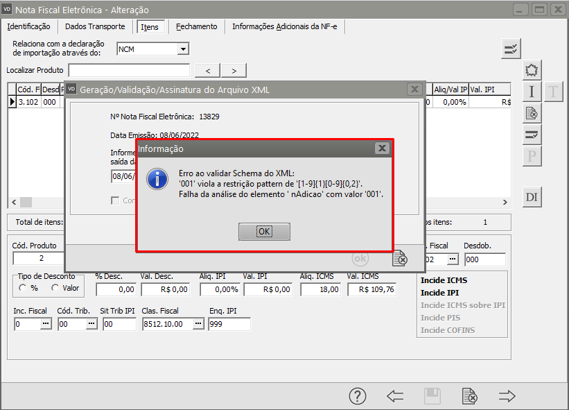 Ao validar Schema do XML: '001' viola a restrição pattern de '[1-9]{1}[0-9]{0,2}'. Falha da análise do elemento ' nAdicao' com valor '001'.