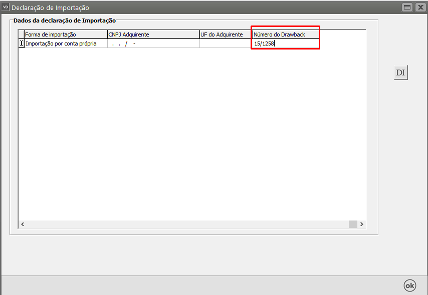 Em seguida vá ao campo Número do Drawback, este campo deve conter apenas números, clique em OK