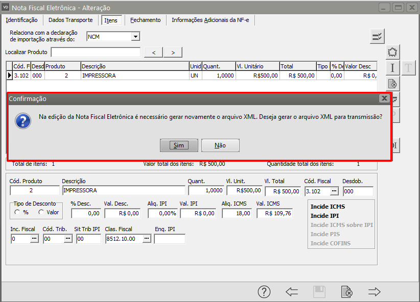 Salve novamente a Nota Fiscal e o Sistema irá questionar se você deseja gerar um novo arquivo XML para Transmissão, clique em SIM.