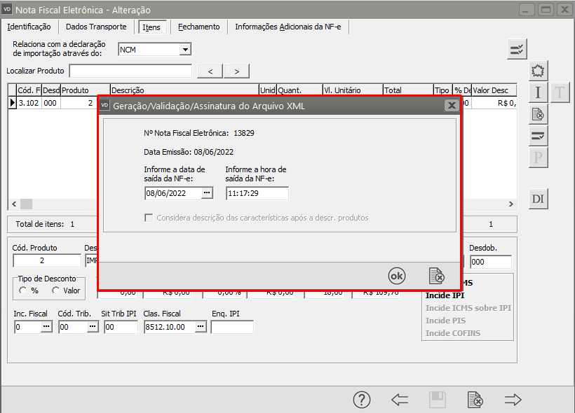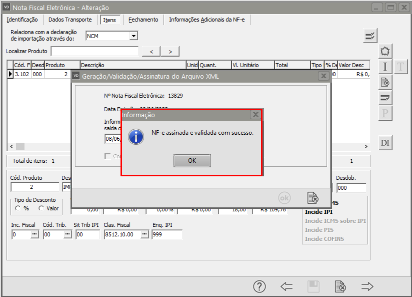 Se todas as informações estiverem corretamente cadastradas a NF-e será assinada e validada com sucesso.