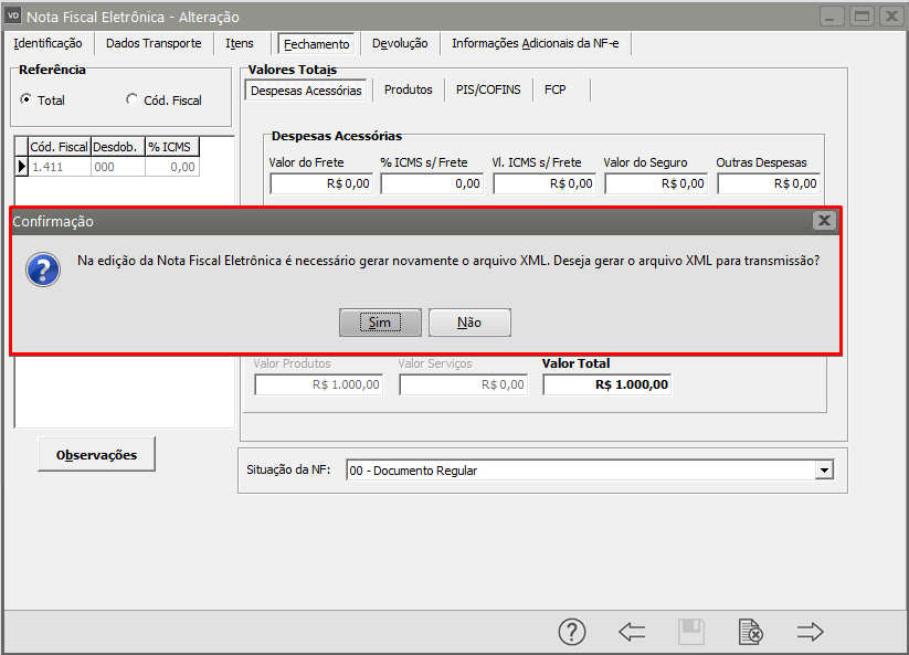 Salve a NF-e e o Sistema irá questionar se deseja gerar um novo XML para a Nota, clique em SIM