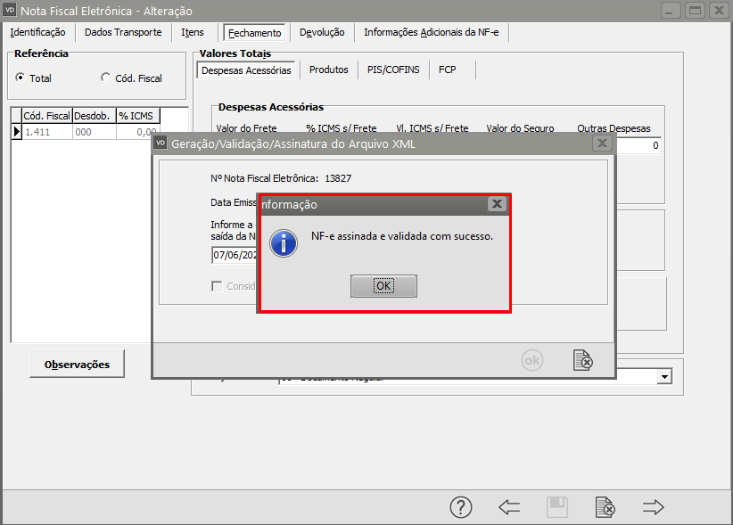 Se todas as informações estiverem corretamente cadastradas a NF-e será assinada e validada com sucesso.