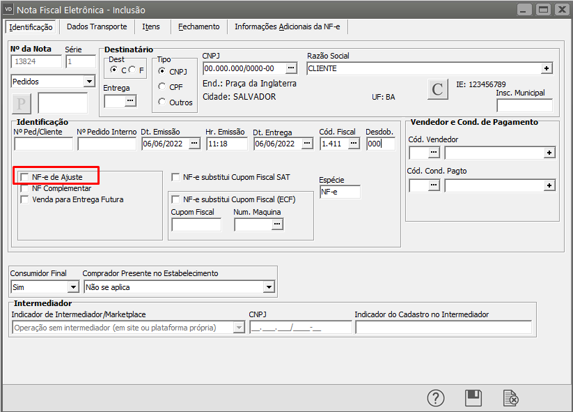 Quando for emitida uma NF-e (Modelo 55) com a Finalidade de Emissão igual a Devolução, Retorno ou NF-e de Ajuste, marcar na aba identificação da NF-e a opção NF-e Ajuste.