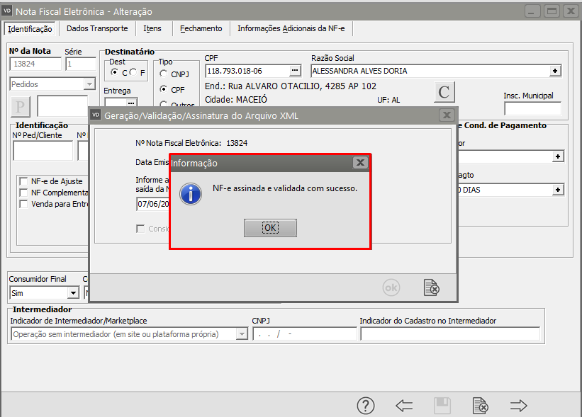 Se todas as informações estiverem corretamente cadastradas a nota fiscal será assinada e validadaautorizada com sucesso.