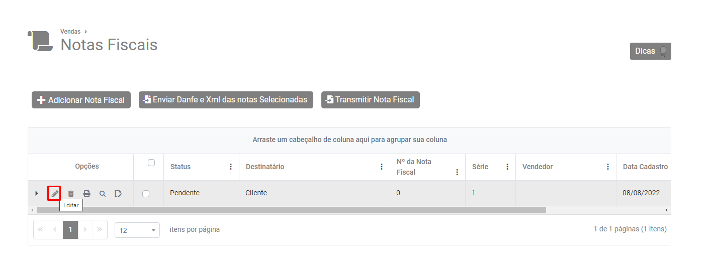 Selecione a Nota e clique no botão Transmitir Nota Fiscal.