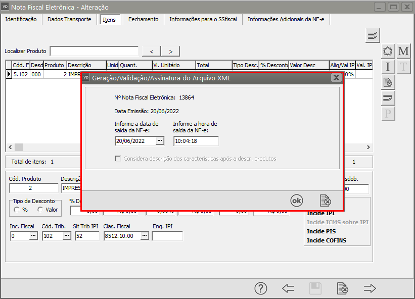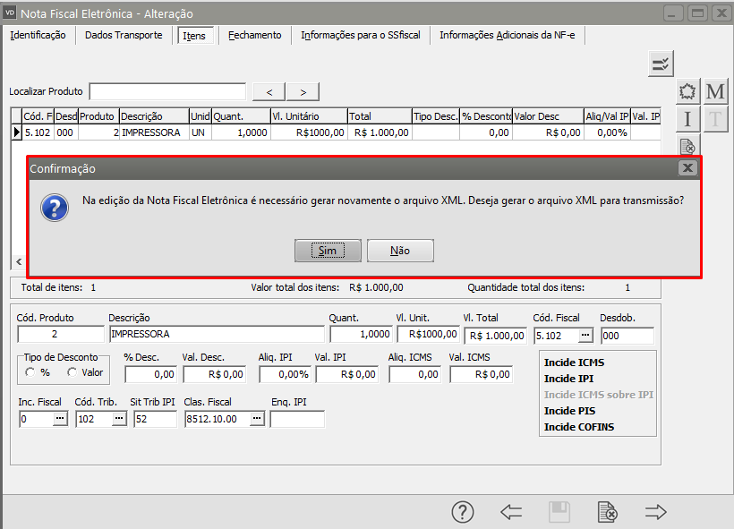 Em seguida salve novamente a NF-e e o Sistema irá questionar se você deseja gerar um novo XML para transmissão, clique em SIM.