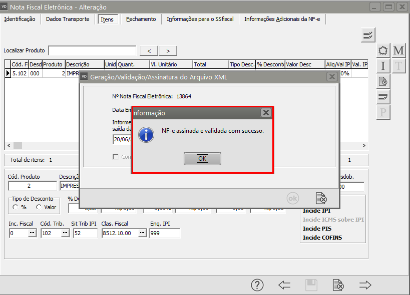 Se todas as informações estiverem corretamente cadastradas a NF-e será assinada e validada com sucesso.