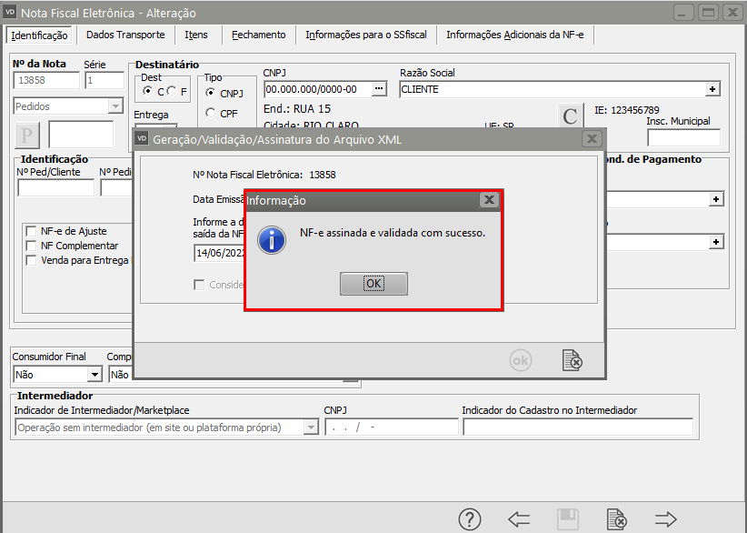 Se todas as informações estiverem corretamente cadastradas, a NF-e será assinada e validada com sucesso.