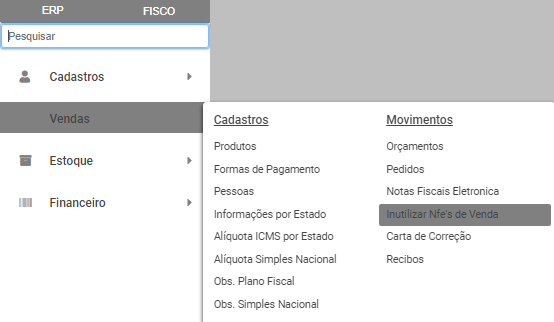 Acesse o menu Vendas>Inutilizar NFe's de Venda