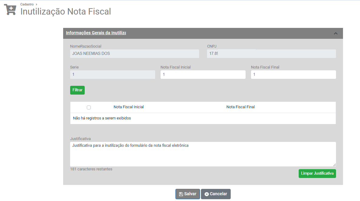 Verifique a Justificativa que foi digitada, se houver caracteres especiais, duplos espaços ou se o texto estiver muito extenso, corrija as informações e salve novamente a Inutilização da Nota Fiscal Eletrônica.