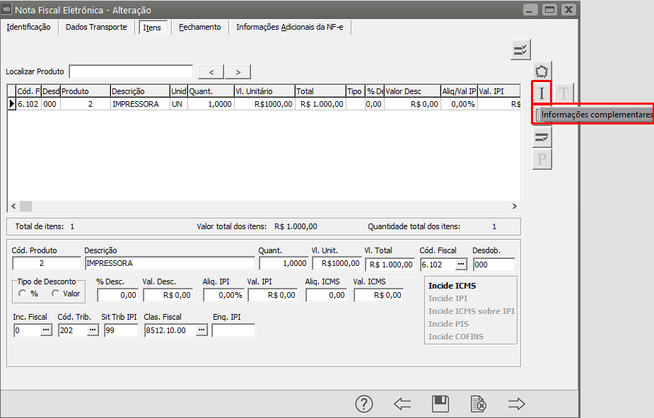 Acesse a aba Itens e clique no botão Informações Complementares.