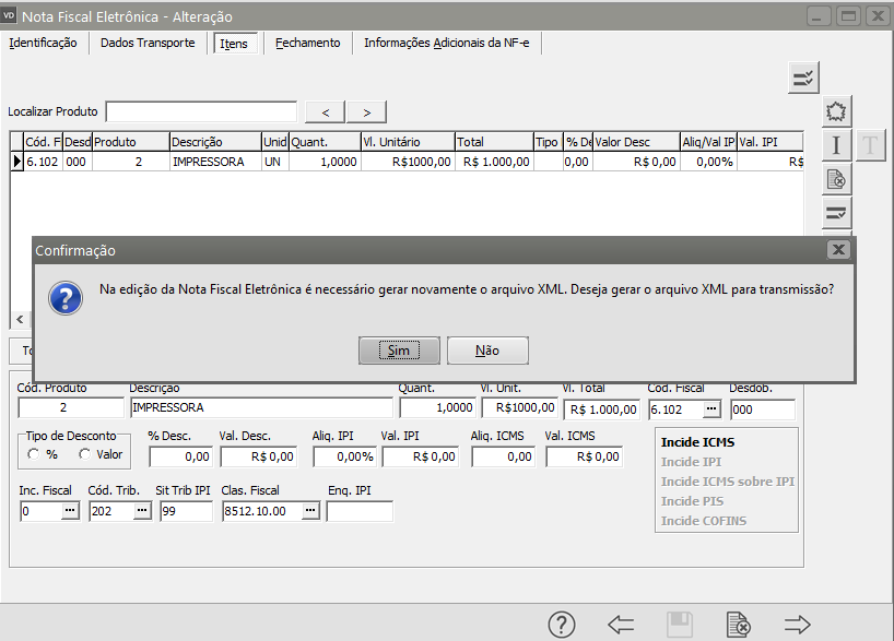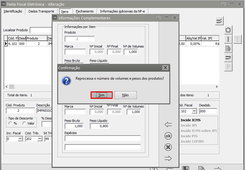 O Sistema questionará se você deseja Reprocessar o número de volumes e pesos dos Produtos, clique em SIM.