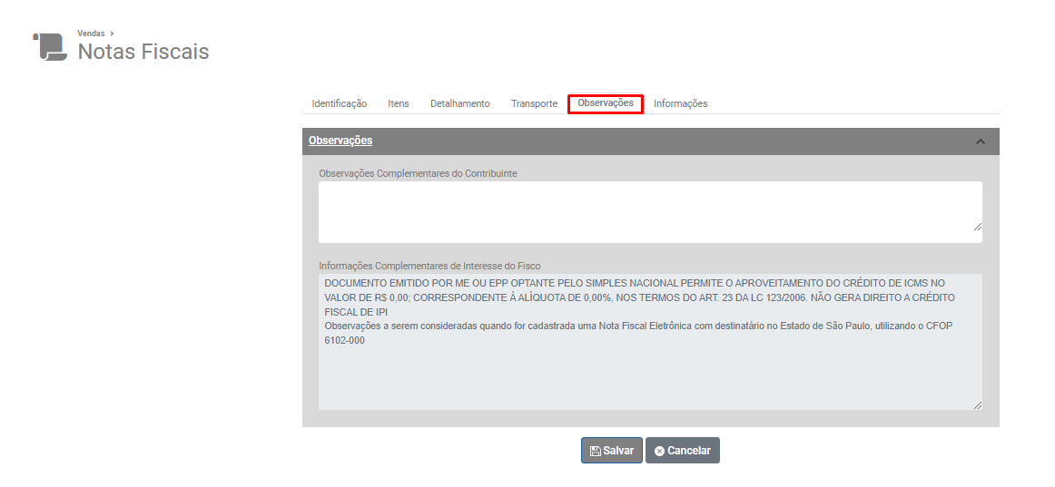 Observações: Caso existam caracteres especiais cadastrados, o ideal é acessar o menu Vendas>Observações Plano Fiscal e Vendas>Observações do Simples Nacional e realizar a correção no menu de origem, desta forma para as próximas notas emitidas com as mesmas observações não será apresentada a mesma inconsistência.