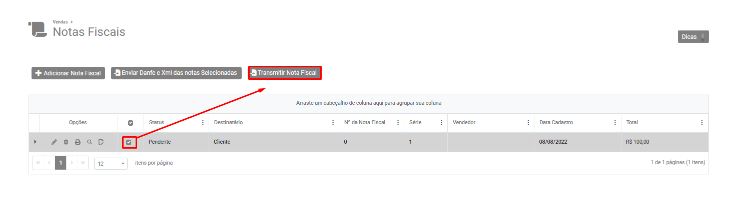 Selecione a Nota e clique no botão Transmitir Nota Fiscal.