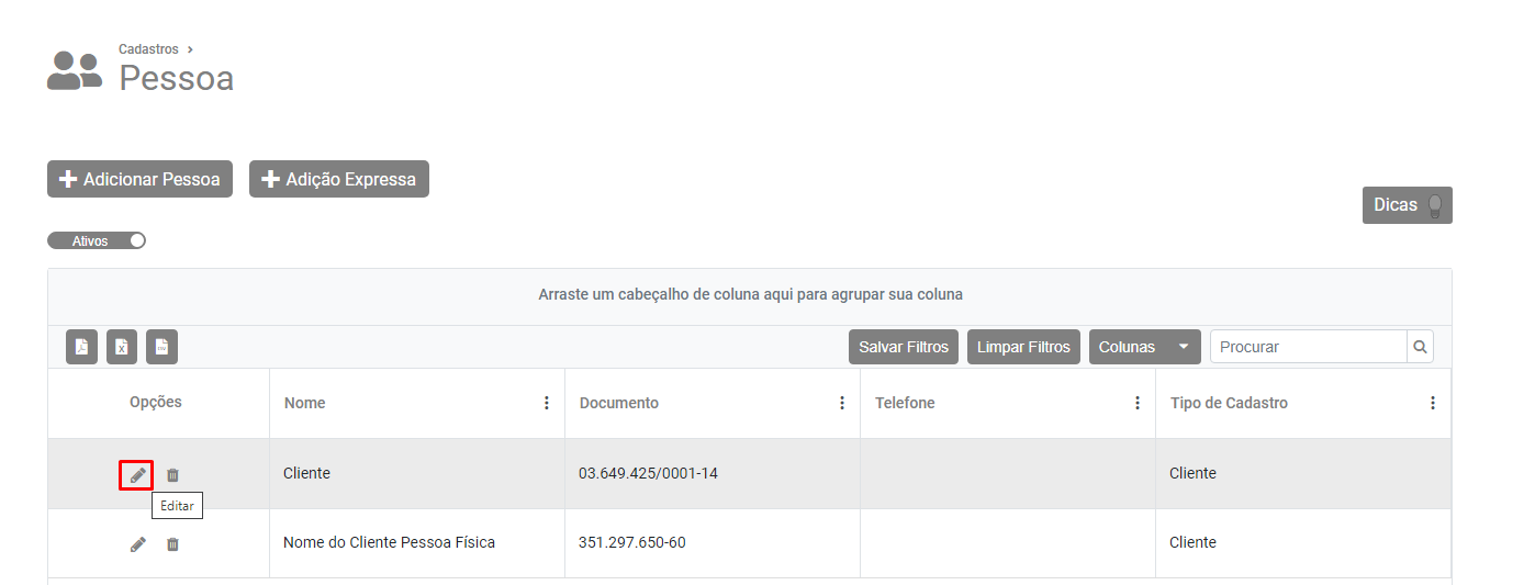Pesquise pelo cliente constante na NFe e edite seu cadastro