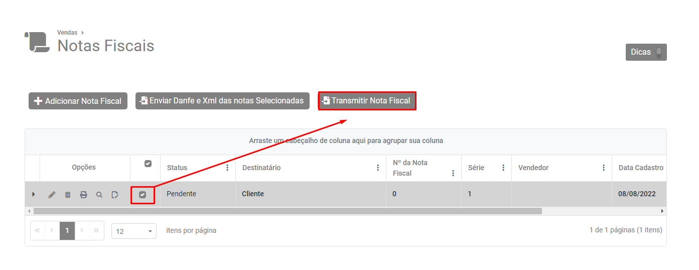 Selecione a nota e clique no botão Transmitir nota fiscal.