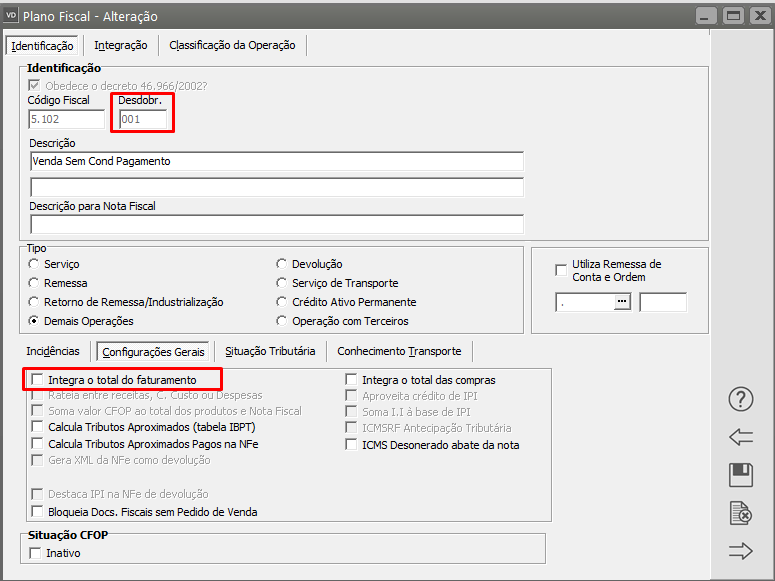 Em caso afirmativo, o CFOP utilizado na NF-e deve estar configurado para Integrar o Faturamento, em caso negativo o CFOP não pode integrar o faturamento. para verificar acesse o menu Manutenção>Plano Fiscal>Manutenção, pesquise pelo CFOP da NF-e e clique na seta Avança, em seguida edite o CFOP.