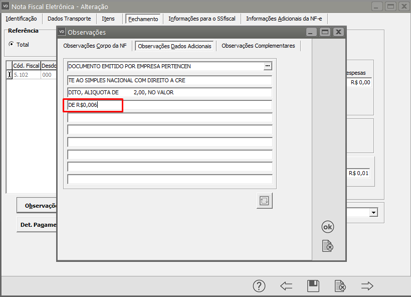 Informe pelo menos R$0,01 de crédito de ICMS ou altere o código de tributação para um código que não recupere crédito de ICMS (verifique com seu contador qual a melhor atitude a ser tomada nessa situação)