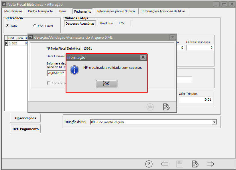 Se todas as informações estiverem corretamente cadastradas a NF-e será assinada e validada com sucesso.
