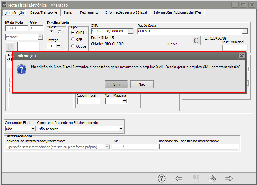 Em seguida salve novamente a Nota Fiscal e o Sistema irá questionar se você deseja gerar um novo XML para transmissão, clique em SIM.
