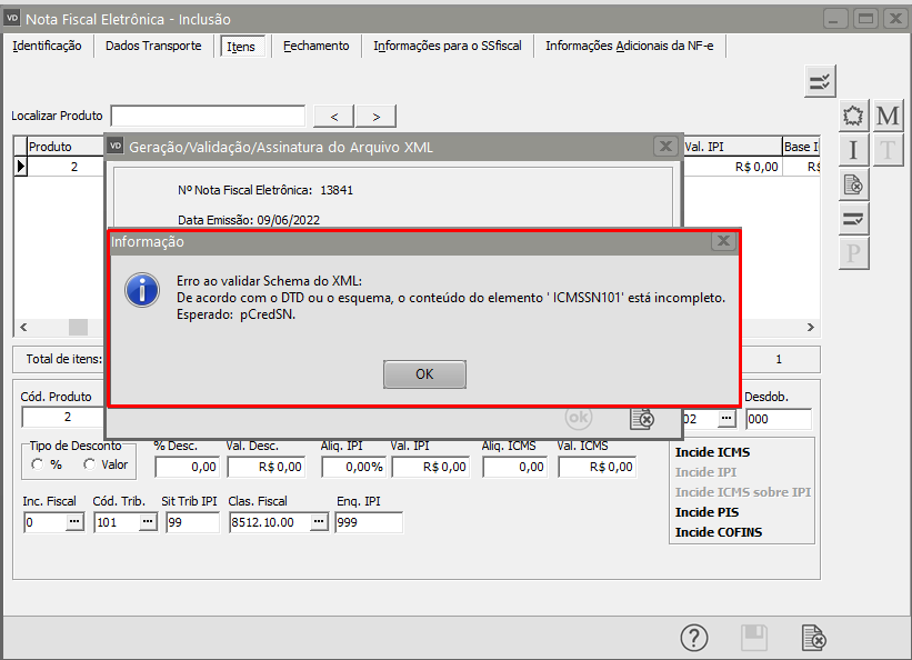 De acordo com o DTD ou o esquema, o conteúdo do elemento “ICMSSN101” está incompleto. Esperado: pCredSN.