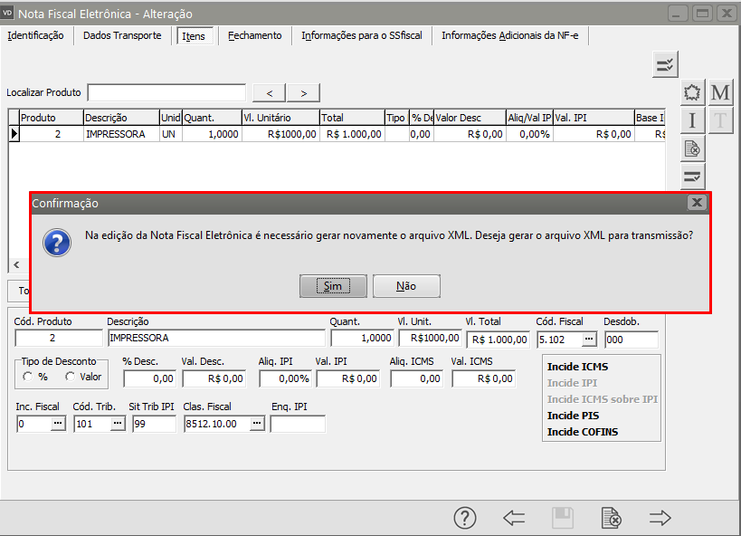 O Sistema apresentará o questionamento se você deseja gerar o arquivo XML para transmissão, clique em SIM